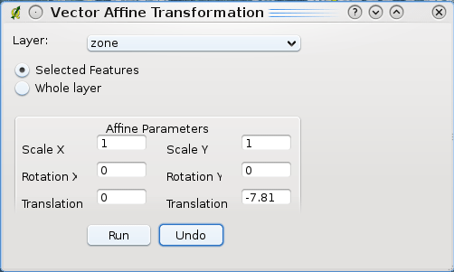 Consente di effettuare operazioni di scalatura, rotazione e traslazione su tutti gli oggetti di un layer o soltanto su quelli precedentemente selezionati (e’ necessario avere abilitato la modalita’ “modifica”). Nel mio caso ho impostato soltanto una traslazione verso sud (negativa, quindi ho anteposto il segno “-“) di 7.81 m.