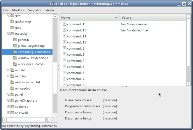 – nella finestra che compare ci spostiamo sulla voce “apps > metacity > keybinding_commands”