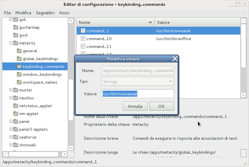 – doppio clic su “command_1” e impostiamo il percorso al programma che vogliamo eseguire: nel mio caso vorrei lanciare Iceweasel quindi inserisco “/usr/bin/iceweasel”