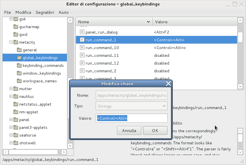 – ci spostiamo poi (nel pannello di sinistra) sulla voce “global_keybindings” , scegliamo il “command_1” scorrendo l’elenco che si presenta a destra; doppio clic su “command_1” e inseriamo la combinazione di tasti che vogliamo dare per il comando in questione: nel mio caso “<Control><Alt>i“.