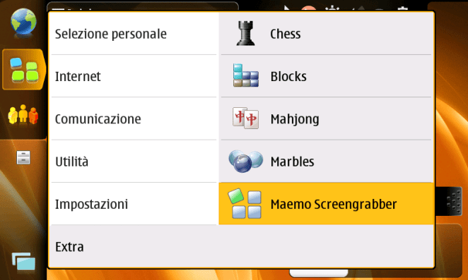 Per ovviare a questo inconveniente ho installato (/in base alle indicazioni riportate nell’howto indicato sopra) il pacchetto “maemo-screen-grabber“. Una volta fatto troviamo una nuova voce in “Extra” chiamata “Maemo screengrabber”. Cliccando su di essa viene eseguito uno screenshot ritardato di 5 secondi; sono piu’ che sufficienti (il tempo di attesa puo’ essere modificato: devo ancora indagare sul come) per andare ad attivare la videata di interesse (magari preparata in precedenza).