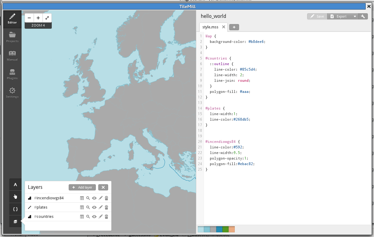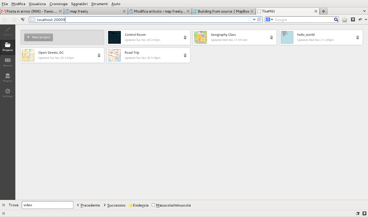 compare l’interfaccia di TileMill. Analogo risultato si ottiene mediante un browser puntando su “http://localhost:20009”.